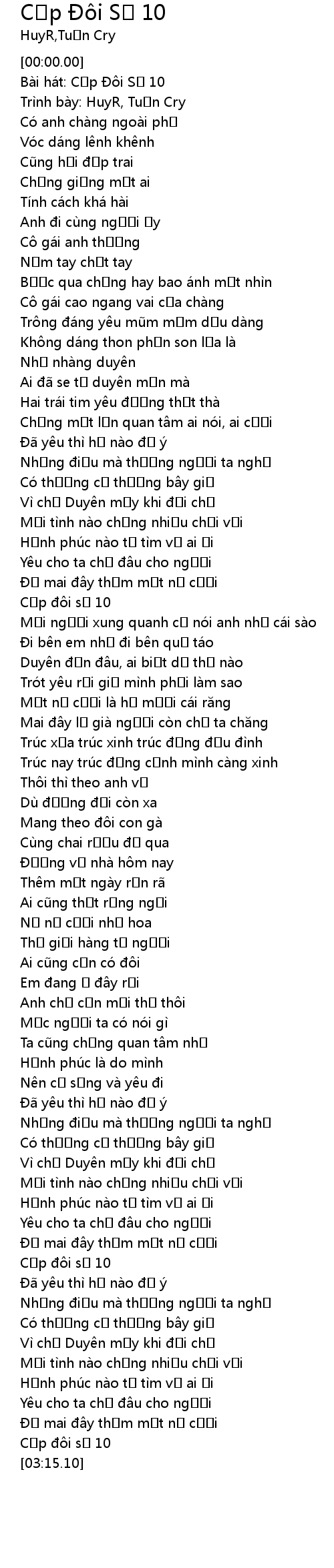 | [00:02.57] | Bài hát: Cặp Đôi Số 10 |