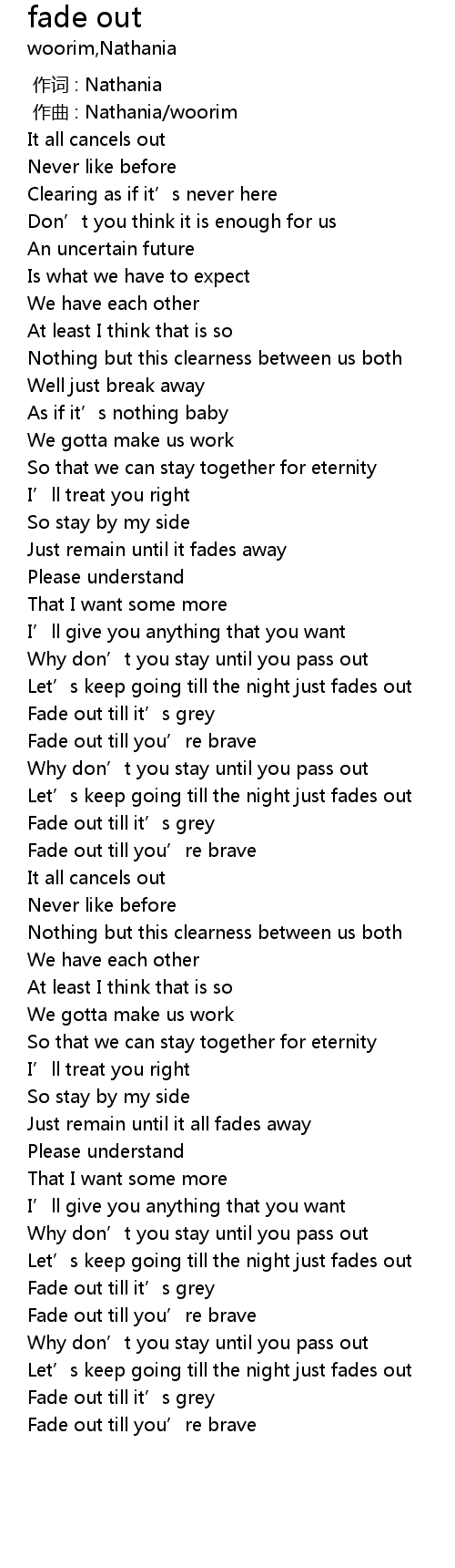 | [02:44.95] | Fade out till it' s grey |