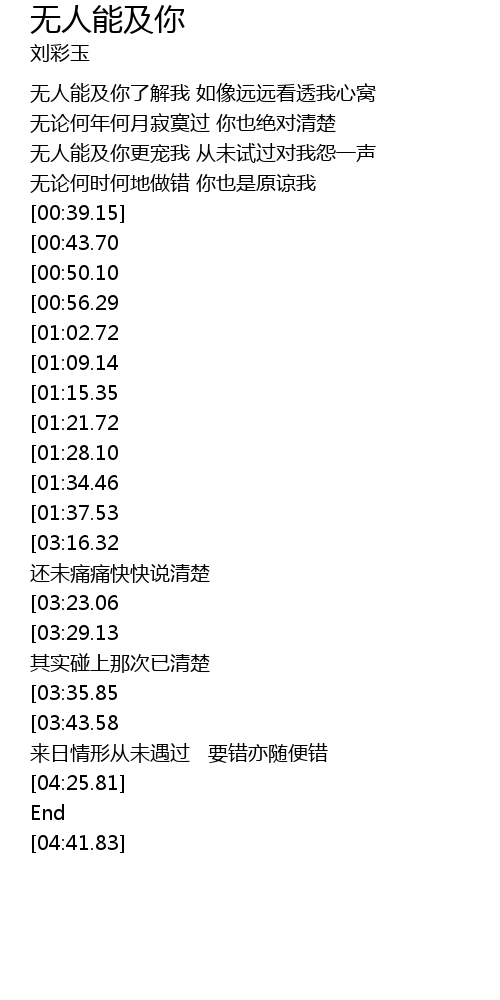 | [03:59.52][03:29.13][01:53.20] | 无人能像你抱紧我 其实碰上那次已清楚 |
