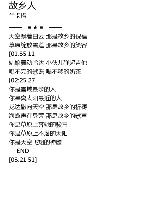 | [00:29.11] | 草原绽放雪莲 那是故乡的笑容 |