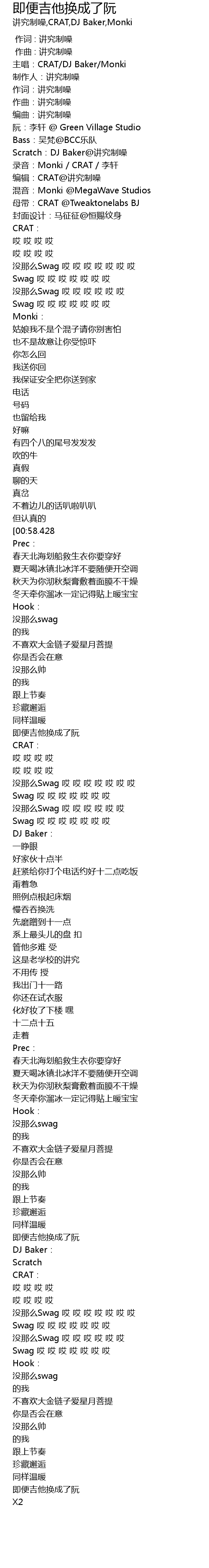 | [01:43.353] | 没那么Swag 哎 哎 哎 哎 哎 哎 哎 |
