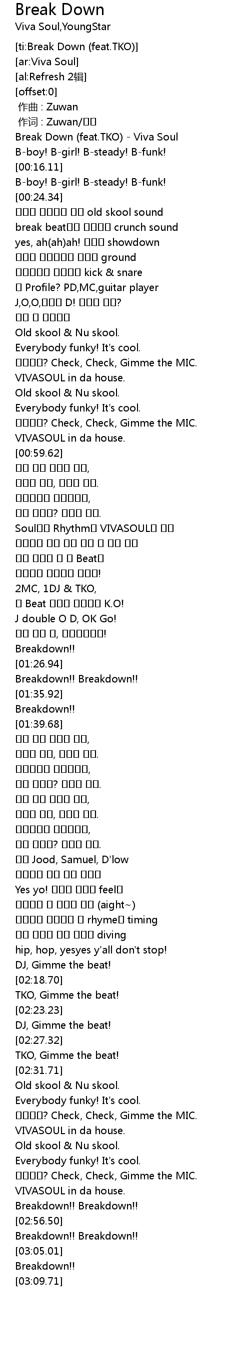 | [00:00.62] | Break Down (feat.TKO) - Viva Soul |