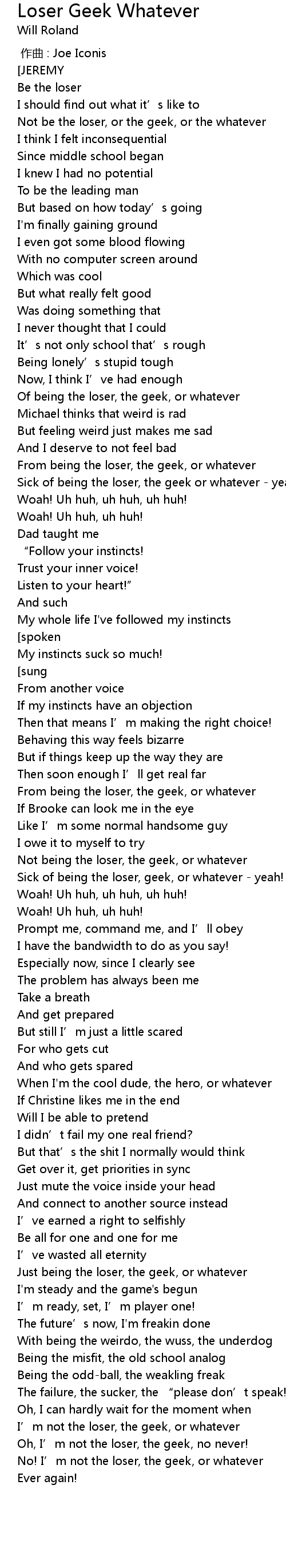 | [00:19.683] | Not be the loser, or the geek, or the whatever |