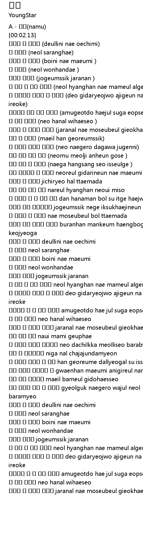 | [03:14.72] | 조금씩 자라난 jogeumssik jaranan |