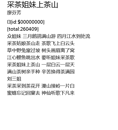 | [01:09.159] | 采茶姑娘茶山走 茶歌飞上白云头 |