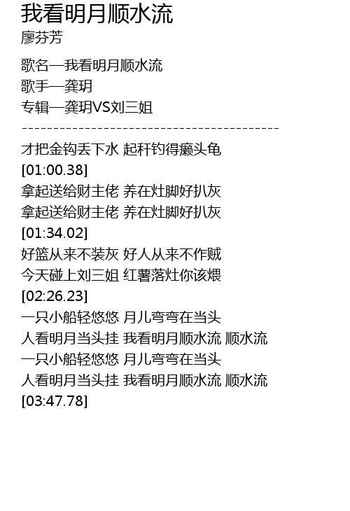 | [02:59.93] | 人看明月当头挂 我看明月顺水流 顺水流 |
