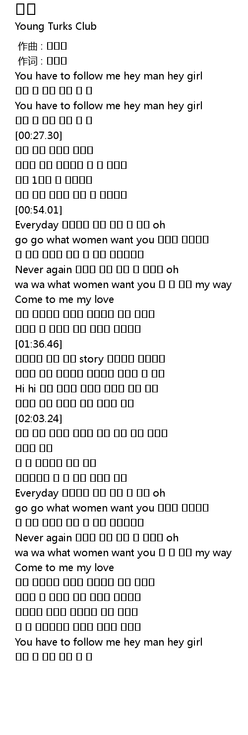 | [00:14.29] | You have to follow me hey man hey girl |