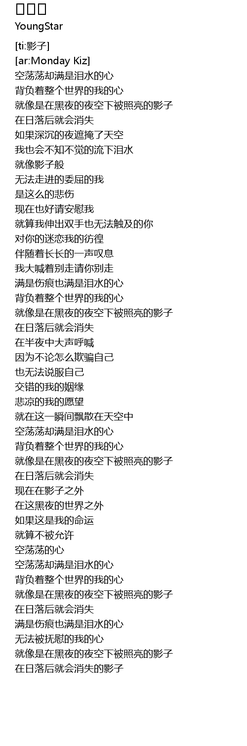 | [01:37.62] | jiu xiang shi zai hei ye de ye kong xia bei zhao liang de ying zi |