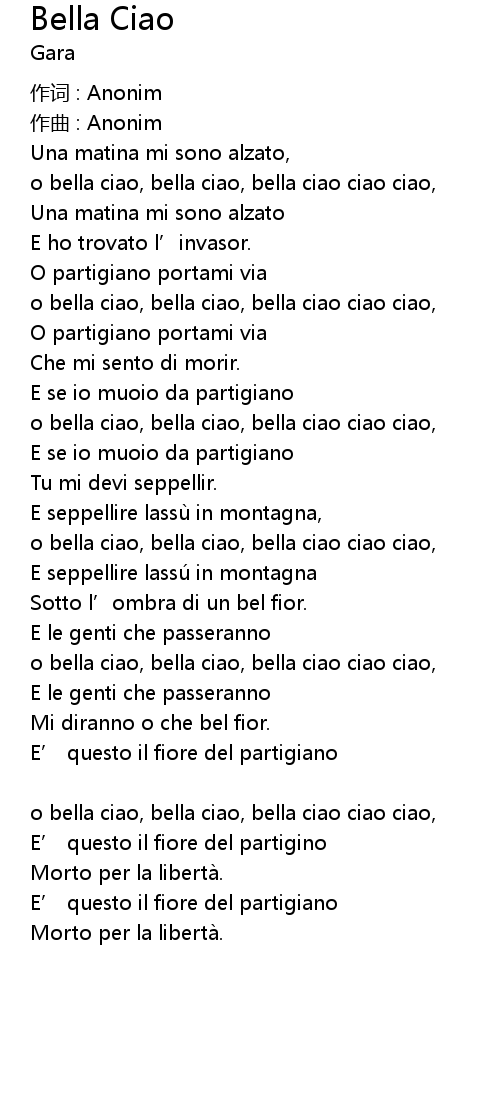 | o bella ciao, bella ciao, bella ciao ciao ciao, | |