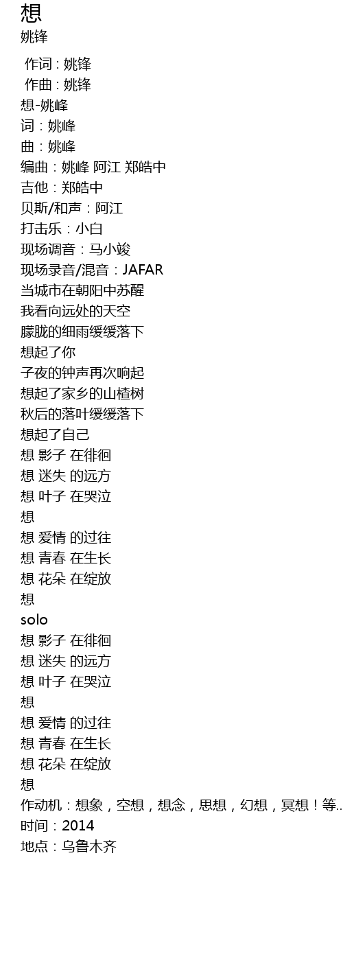 | [04:19.449] | 作动机:想象,空想,想念,思想,幻想,冥想!等.......,这首歌写了很久,我们每个人都有很多想法,我记录了自己所想的,这是在自己特别空的时候创作的,那天下了雨,看着窗户玻璃的雨滴慢慢滑落,看着远方,便有了这首歌,谢谢支持原创音乐。 |