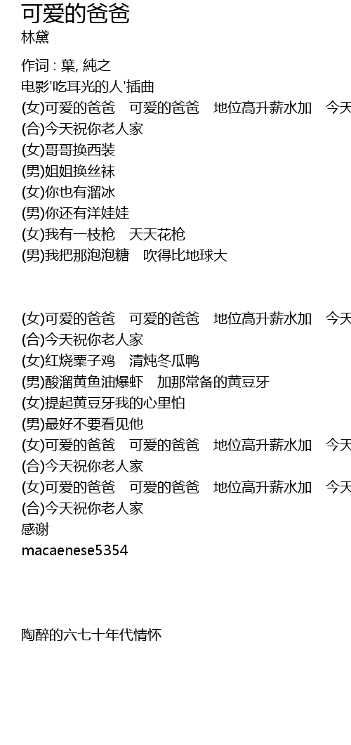 | (女)可爱的爸爸 可爱的爸爸 地位高升薪水加 今天祝你老人家 | |