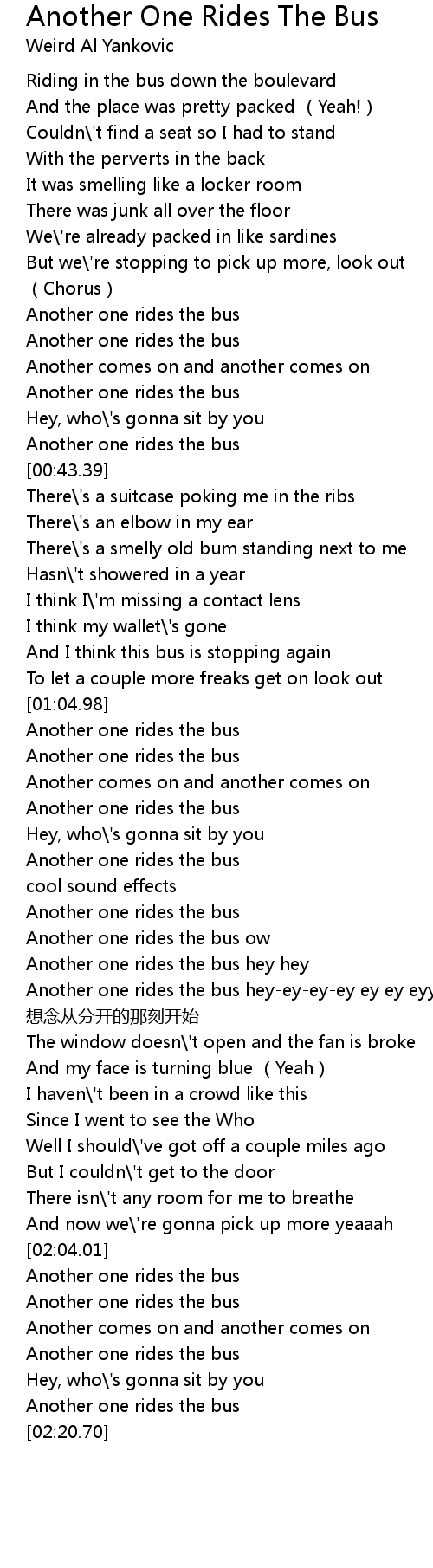 | [01:40.19] | Another one rides the bus hey-ey-ey-ey ey ey eyyyyyy |