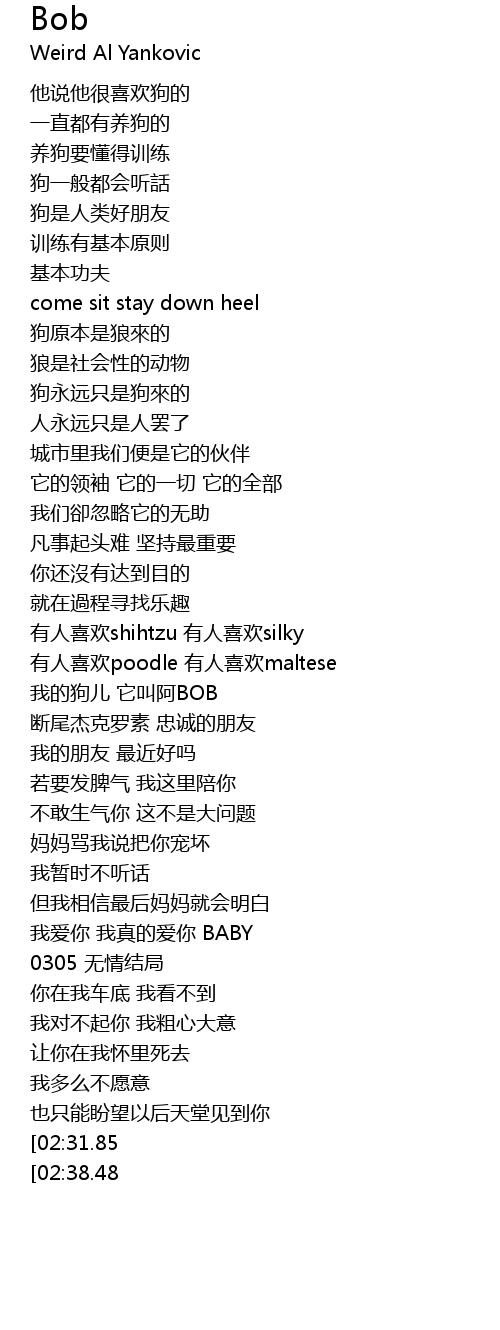 | [01:22.09] | wǒ de gǒu ér tā jiào ā BOB |
