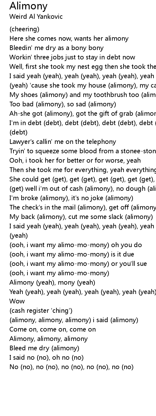 (get) well i'm out of cash (alimony), no dough (alimony) |