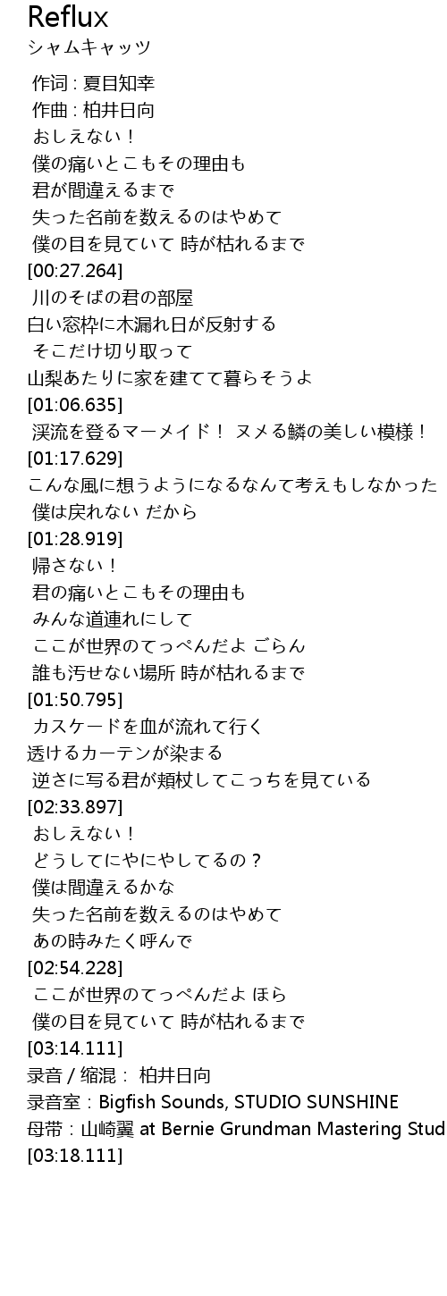 | [02:13.514] | カスケードを血が流れて行く 透けるカーテンが染まる |