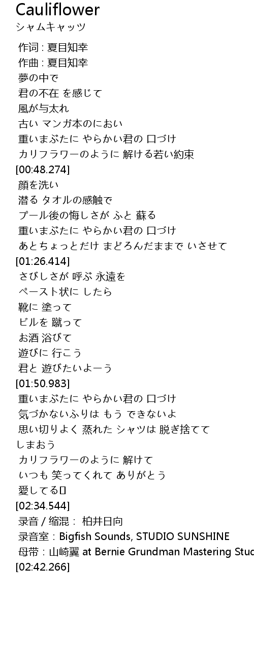 | [00:39.302] | カリフラワーのように 解ける若い約束 |