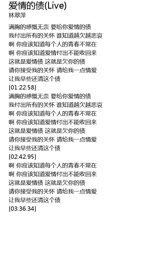 | [00:59.68] | 这就是爱情债 这就是欠你的债 |