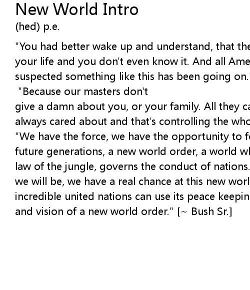 "You had better wake up and understand, that there are people who are guiding your life and you don't even know it. And all American citizens I think, have suspected something like this has been going on." [~ Matrix of Power: Jordan Maxwell 1992 - Freemasonry Connections to Illuminate] "Because our masters don't give a damn about you, or your family. All they care about is what they have always cared about and that's controlling the whole damn world." [~ Zeitgeist] "We have the force, we have the opportunity to forge, for our selves and for future generations, a new world order, a world where the rule of law, not the law of the jungle, governs the conduct of nations. When we are successful, and we will be, we have a real chance at this new world order, an order in which incredible united nations can use its peace keeping role to fulfill the promise and vision of a new world order." [~ Bush Sr.]