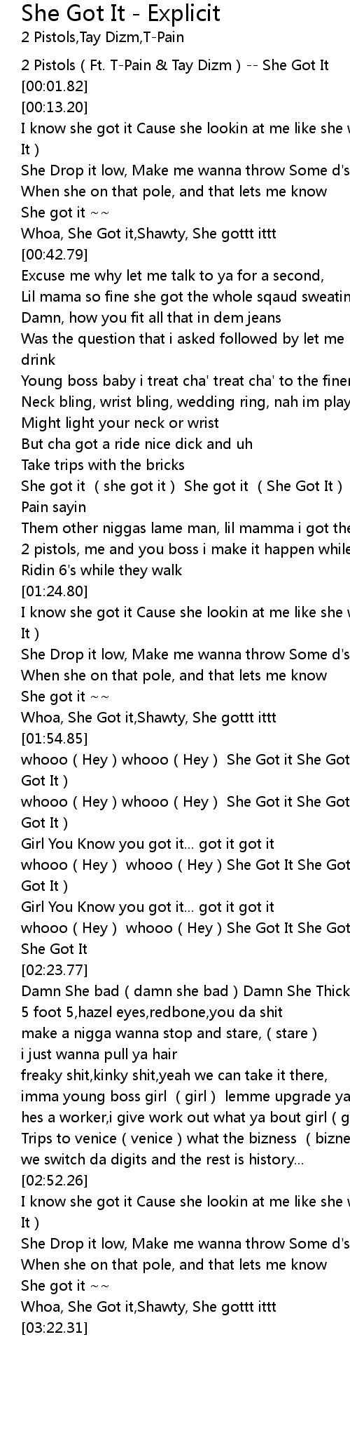 | [02:02.65] | whooo Hey whooo Hey She Got it She Got It She Got it She Got It |