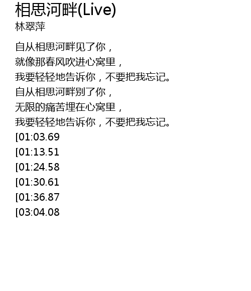 | [02:52.03][01:30.61] | 自从相思河畔别了你, |