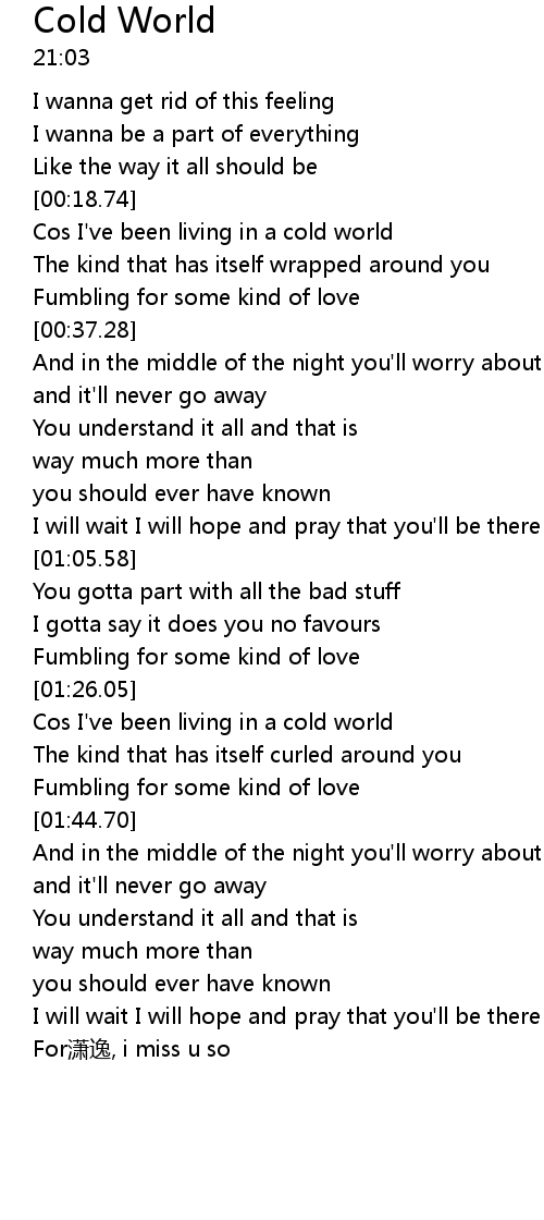 | [00:19.55] | Cos I've been living in a cold world |