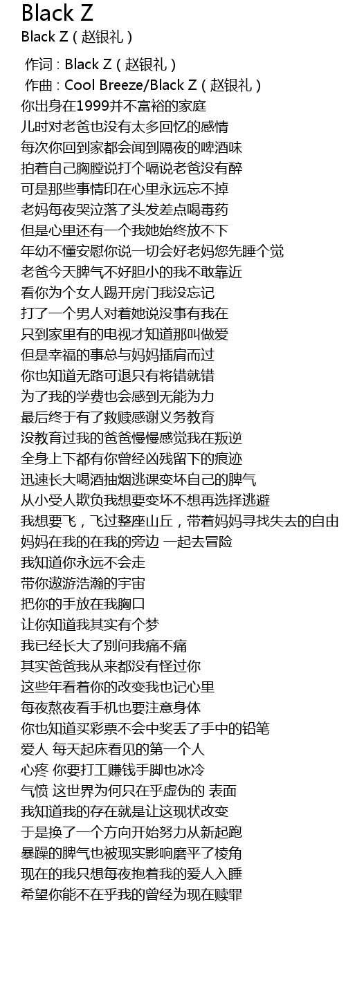 | [00:00.000] | 作词 : Black Z(赵银礼) |