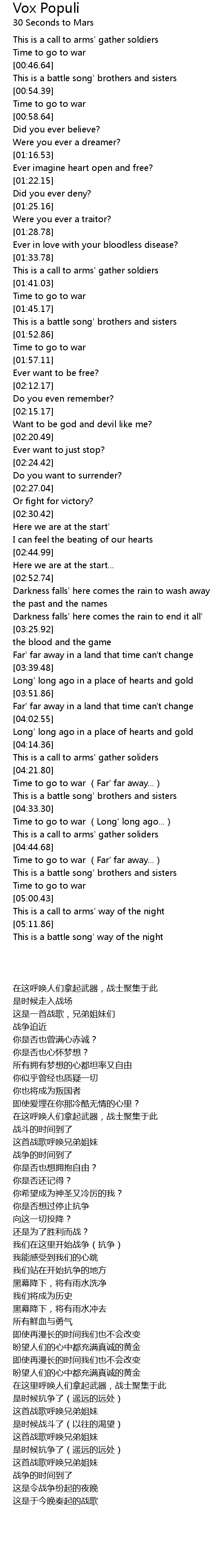 | [00:38.20] | This is a call to arms' gather soldiers |