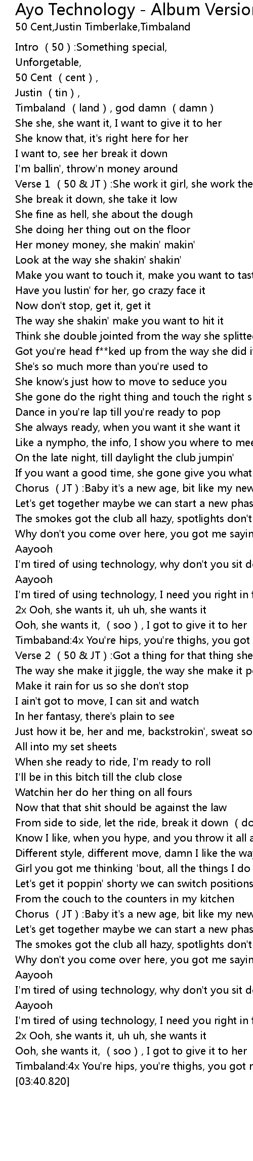 | [02:03.570] | Verse 2 50 JT: Got a thing for that thing she got |