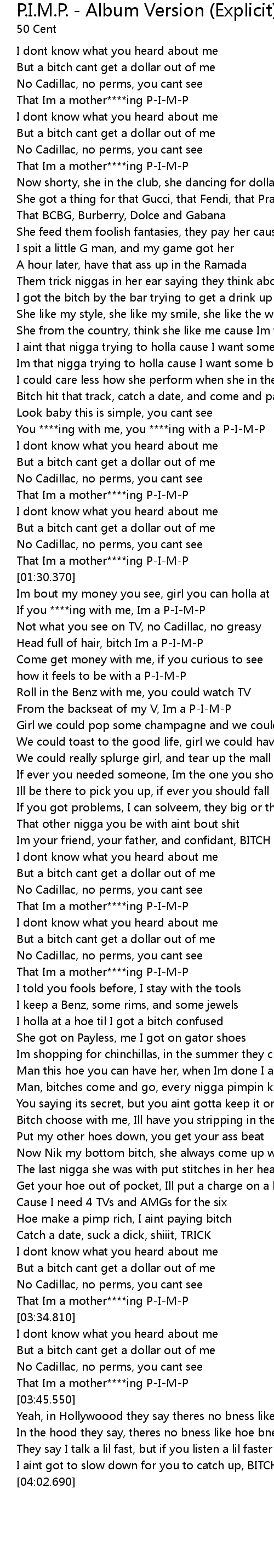| [01:34.330] | If you ****ing with me, Im a P-I-M-P |