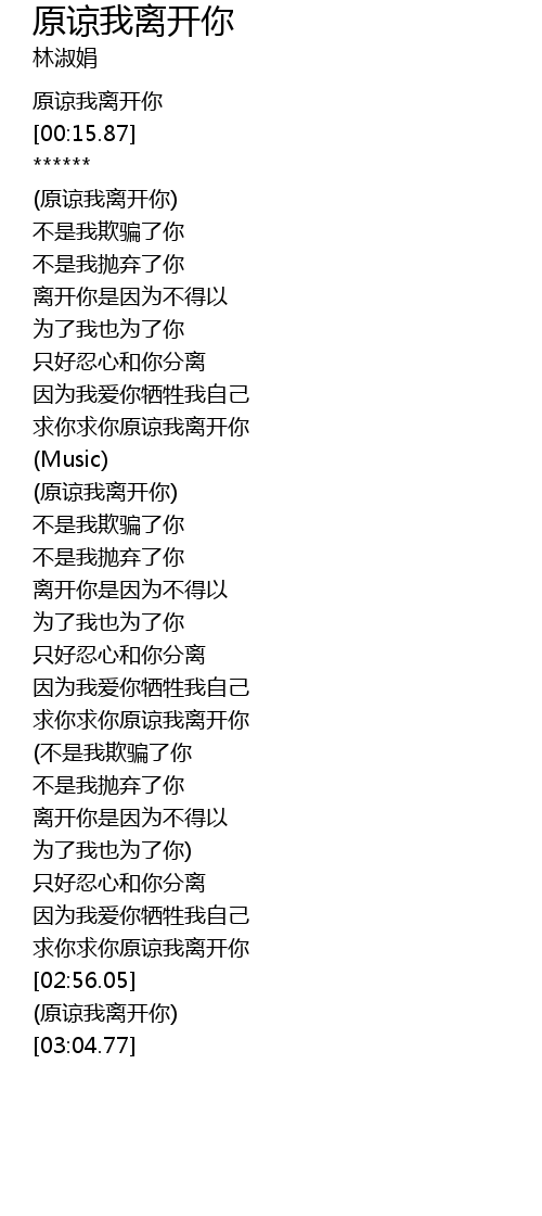 | [02:43.49] | qiú nǐ qiú nǐ yuán liàng wǒ lí kāi nǐ |