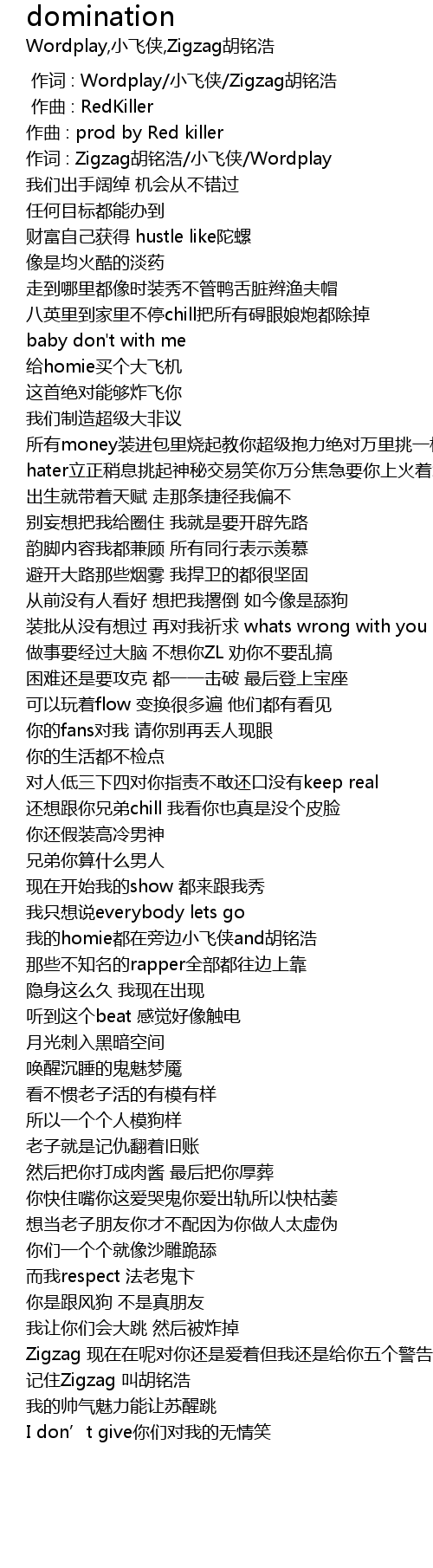 | [00:14.982] | 作词 : Zigzag胡铭浩/小飞侠/Wordplay |