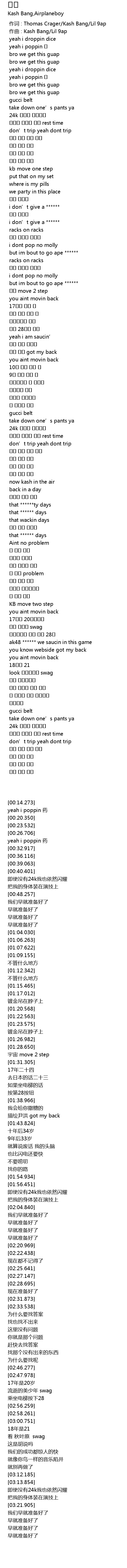 | [00:00.000] | 作词 : Thomas Crager/Kash Bang/Lil 9ap |