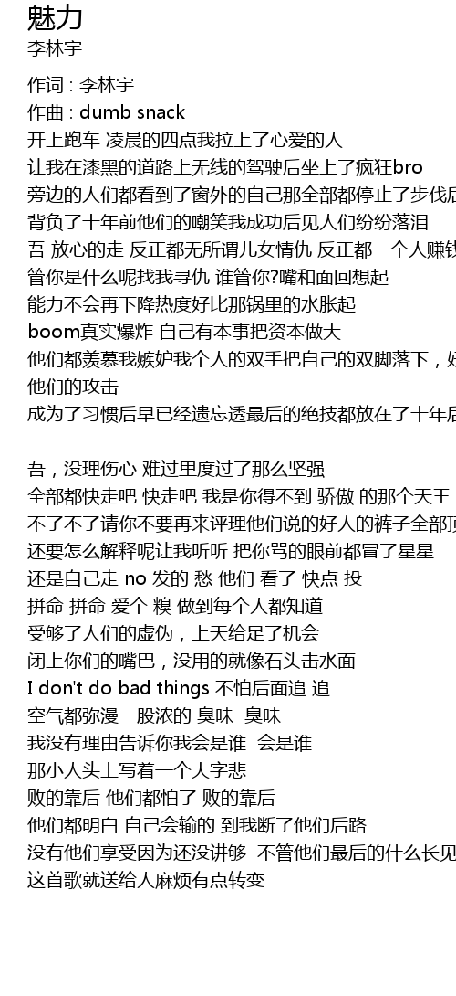| 开上跑车 凌晨的四点我拉上了心爱的人 让我在漆黑的道路上无线的驾驶后坐上了疯狂bro 旁边的人们都看到了窗外的自己那全部都停止了步伐后自己体会 背负了十年前他们的嘲笑我成功后见人们纷纷落泪 | |