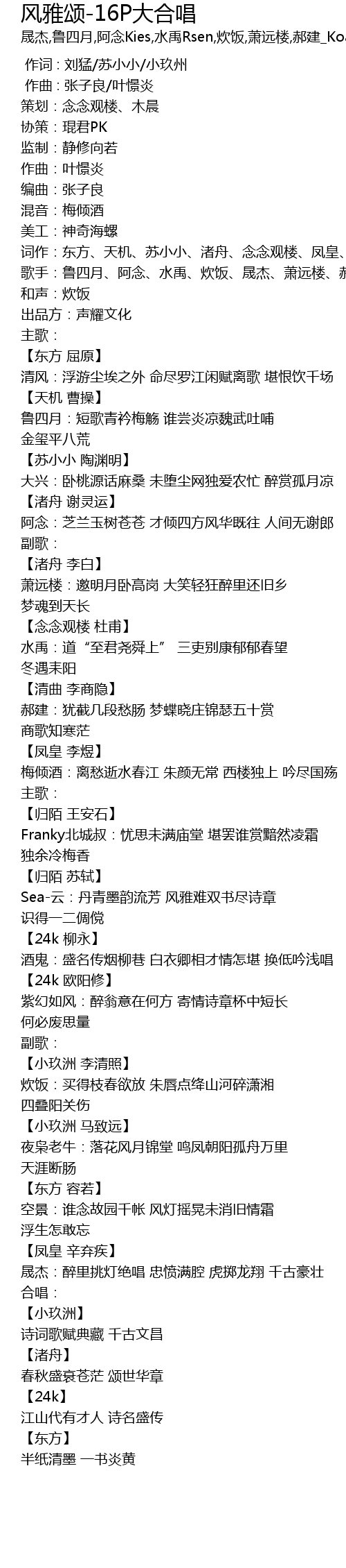 | [00:18.691] | 词作:东方、天机、苏小小、渚舟、念念观楼、凤皇、归陌、24k、小玖洲 |