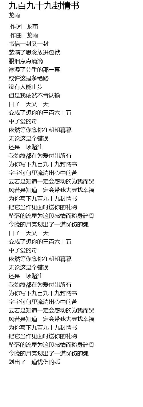 | [03:29.56] | wèi nǐ xiě xià jiǔ bǎi jiǔ shí jiǔ fēng qíng shū |