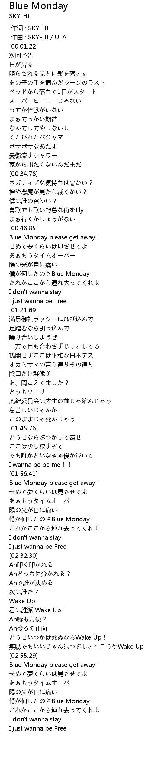 | [02:56.91] | Blue Monday please get away! |