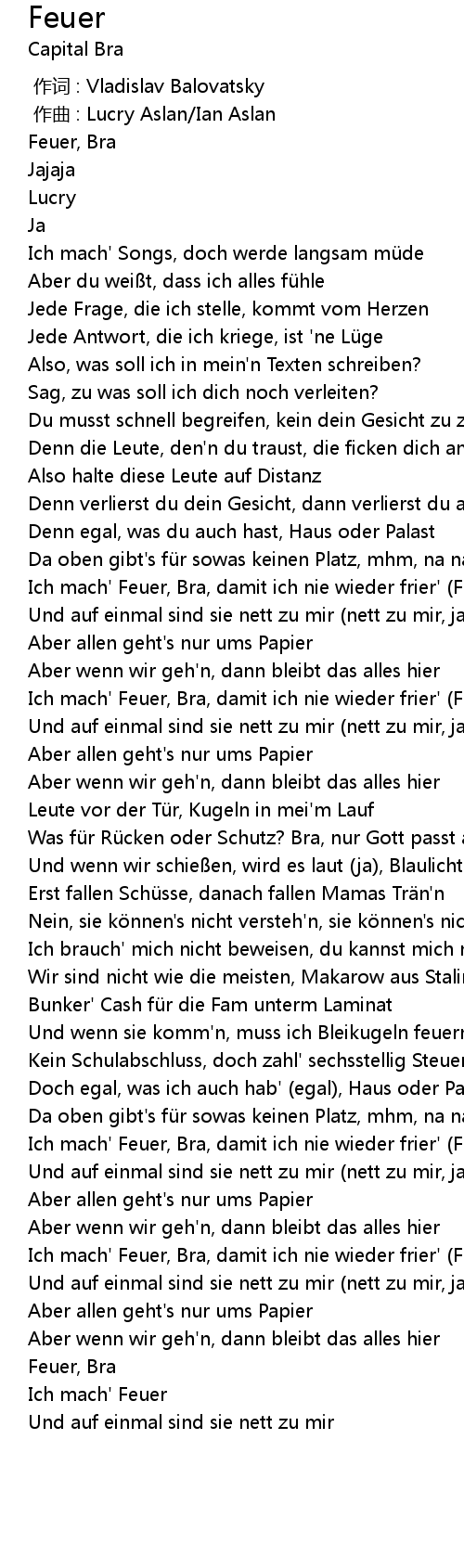 | [00:53.27] | Ich mach' Feuer, Bra, damit ich nie wieder frier' (Feuer, Bra) |