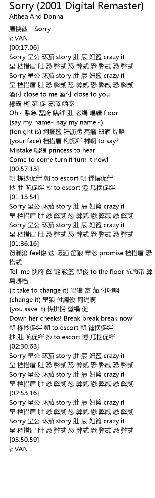 | [02:43.17] | Sorry 呈公 环茄 story 肚 辰 妇篮 crazy it |