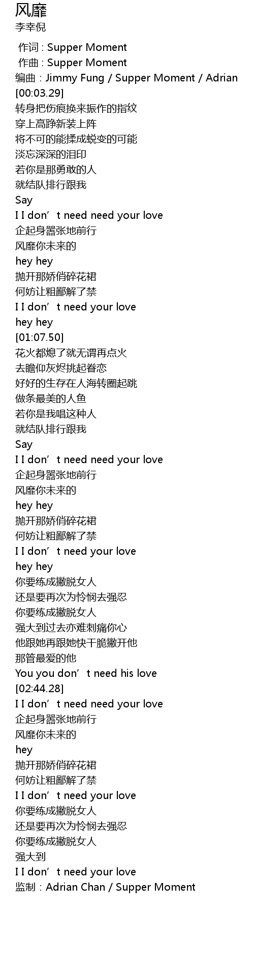 | [03:30.57] | 监制:Adrian Chan / Supper Moment |