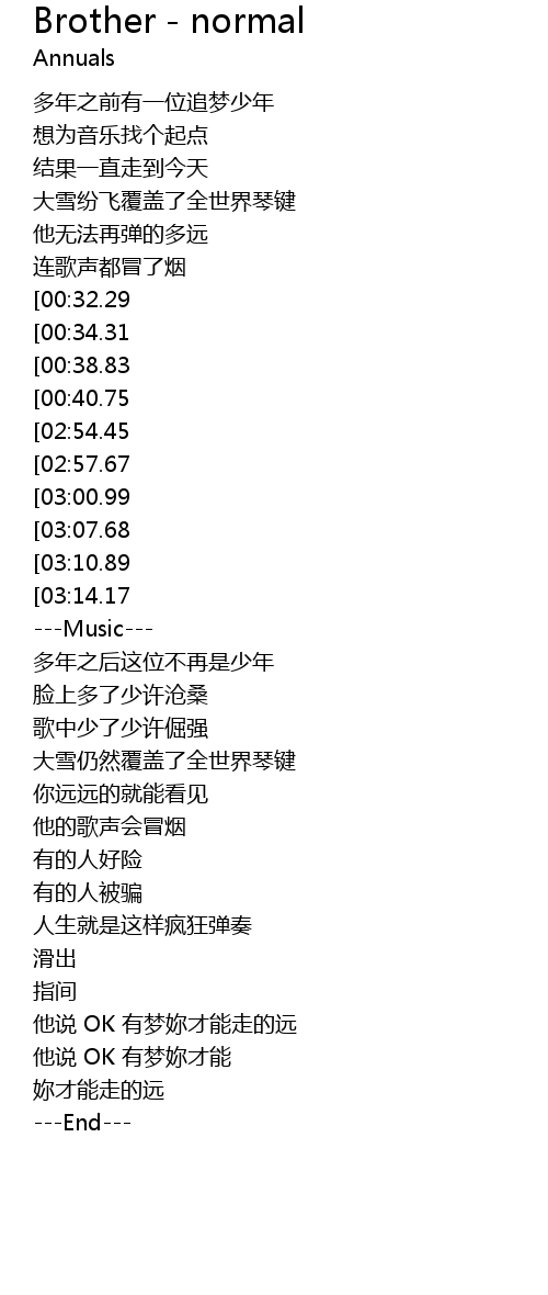 | [03:20.80][02:54.45][02:14.63][00:48.61] | 哥哥说 Byebye My Brother |