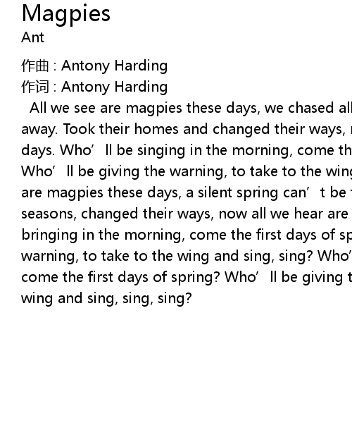 | All we see are magpies these days, we chased all the pretty little songbirds away. Took their homes and changed their ways, now all we see are magpies these days. Who' ll be singing in the morning, come the first days of spring? Who' ll be giving the warning, to take to the wing and sing, sing? All we hear are magpies these days, a silent spring can' t be that far away. Stole their seasons, changed their ways, now all we hear are magpies these days. Who' ll be bringing in the morning, come the first days of spring, who' ll be giving the warning, to take to the wing and sing, sing? Who' ll be singing in the morning, come the first days of spring? Who' ll be giving the warning, to take to the wing and sing, sing, sing? |