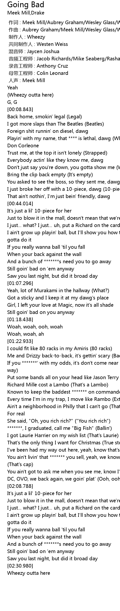 | [00:00.000] | zuò cí : Meek Mill Aubrey Graham Wesley Glass Westen Weiss |