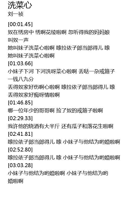 | [00:48.37] | 她叫妹子洗菜心啦啊 嗦拉依子郎当郎得儿 嗦 |