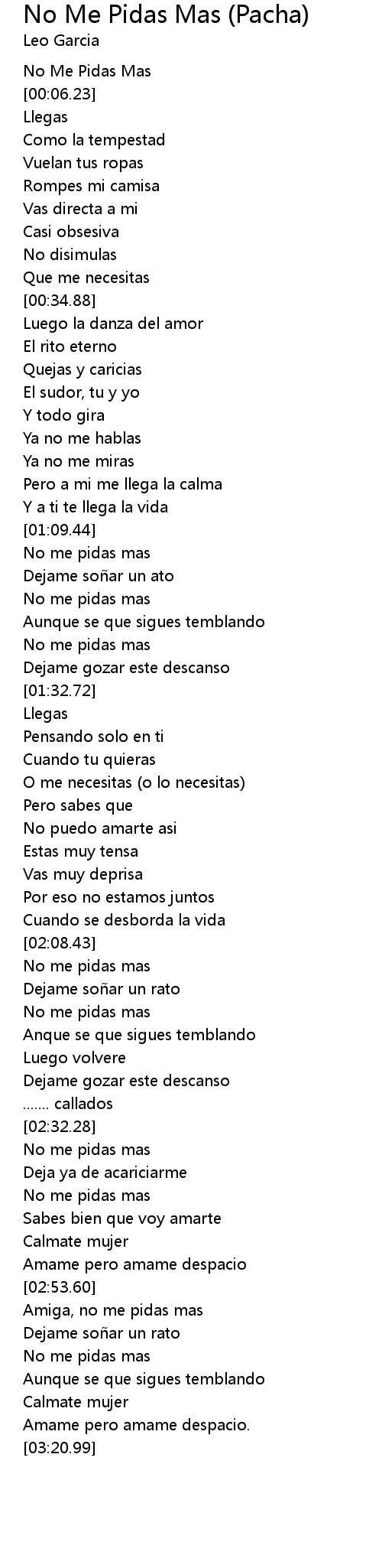 | [03:01.54] | No me pidas mas |
