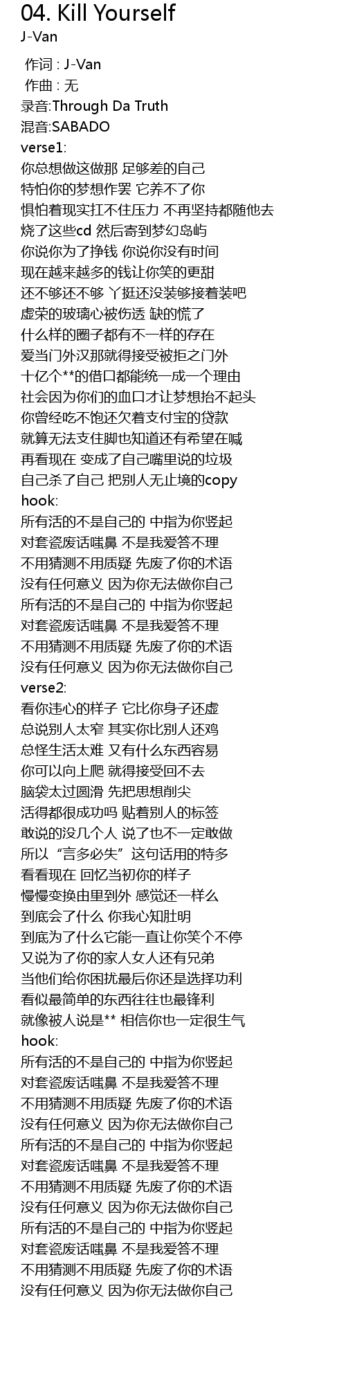 | [02:14.644] | 所有活的不是自己的 中指为你竖起 |