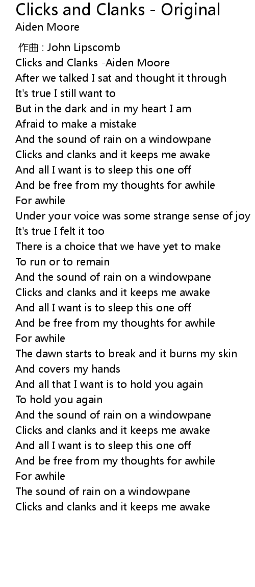 | [00:00.00] | Clicks and Clanks Aiden Moore |
