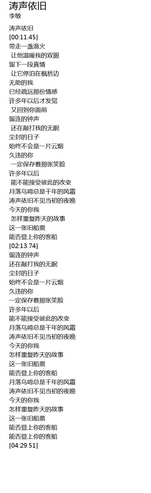 | [01:49.43] | 涛声依旧不见当初的夜晚 |