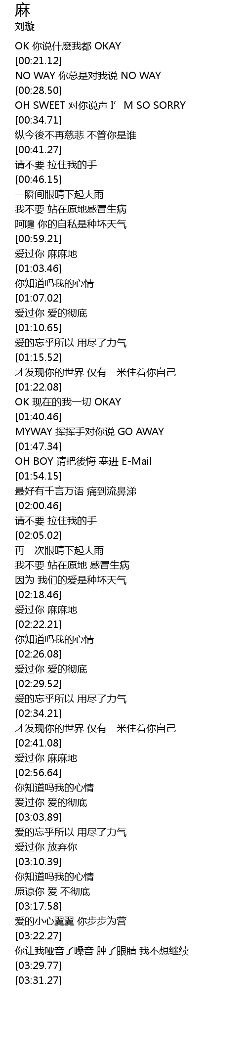 | [02:54.27] | 爱过你 麻麻地 |