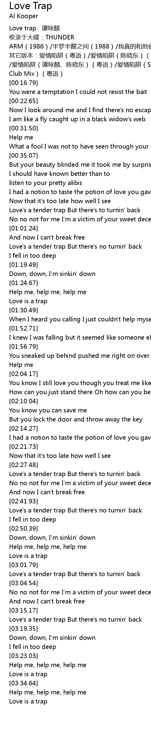 | [00:10.11] | 其它版本:爱情陷阱(粤语)/爱情陷阱(陈晓东)(粤语) |