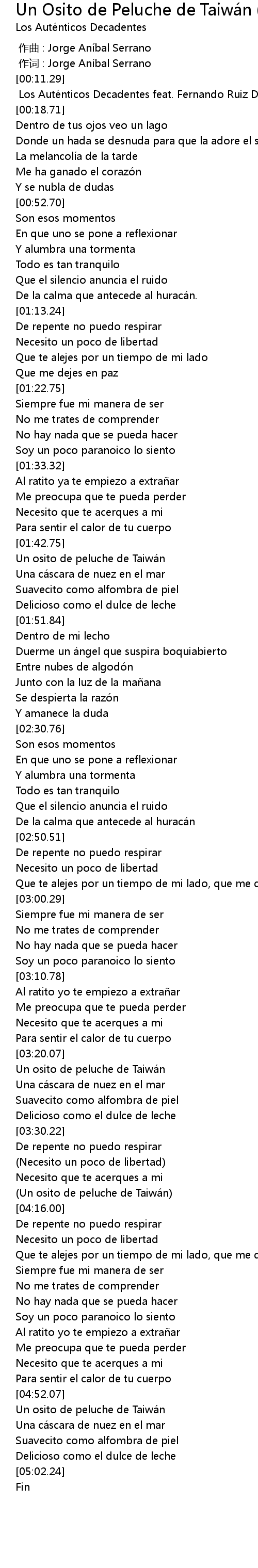 | [00:14.41] | Los Auténticos Decadentes feat. Fernando Ruiz Díaz (Catupecu Machu) |